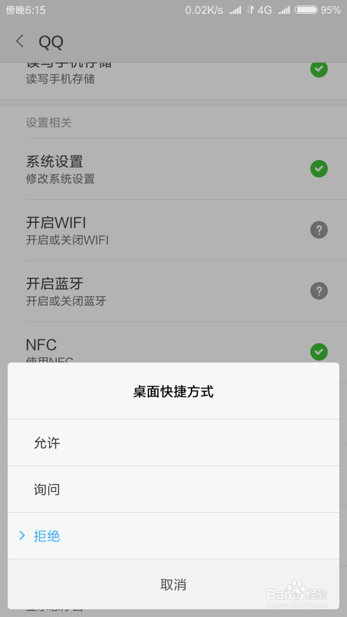 如下图所示,这样我就成功将QQ的添加桌面快捷图标的权限由拒绝改为允许,成功修改的这项手机权限。