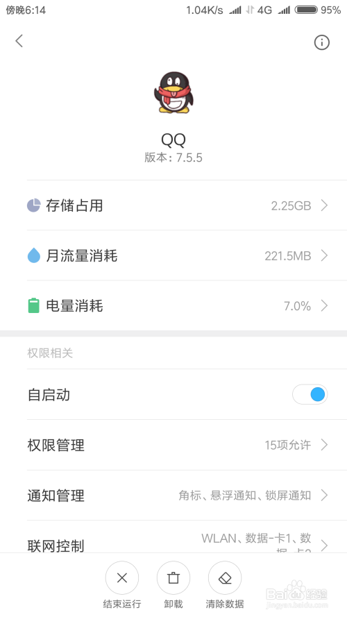 我们长按后台应用中的QQ界面,即可进入如下界面,我们该应用如QQ的存储占用,流量消耗等详细信息。如下