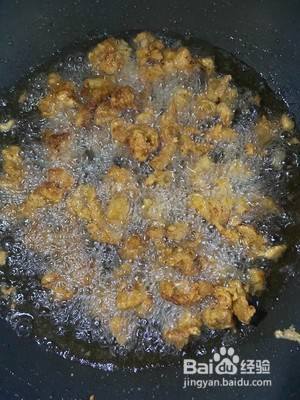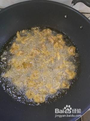 锅中留底油,切姜蒜爆香,倒入炸好的鸡肉块,炒至变色,倒入酱汁、拌匀、大火收汁。