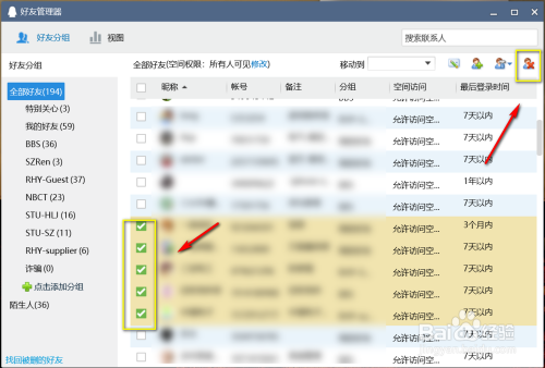 勾选你要删除的好友,点击删除按钮,如下图所示