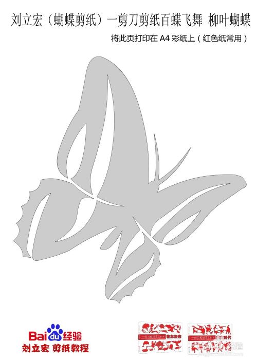 一剪刀剪纸是刘立宏先生为剪纸爱好者学习原创绘制的剪纸教程。精心推出刘立宏(蝴蝶剪纸)一剪刀剪纸百蝶飞舞系类剪纸作品,希望大家喜欢!刘立宏始终励志于剪纸的弘扬和传承,一直以来中国传统剪纸由于图纸少,教程少,难度大,耗时长,很难推广和教学,刘立宏提供的剪纸图纸都是可以临摹打印制作的,这样加大了剪纸的可以实施教学性。从打印临摹--到照图写生--最后在原创设计。希望刘立宏剪纸教程给您带来快乐,一剪刀剪纸教程也会不断的完善提高。谢谢大家的支持!刘立宏在网络分享的手工艺教程已有4000余篇。在百度经验分享的教程为一剪刀剪纸教程都带有A4打印用图,方便爱好者的制作。此篇文章分享的是,刘立宏(蝴蝶剪纸)一剪刀剪纸百蝶飞舞 050柳叶蝴蝶 刘立宏(蝴蝶剪纸)一剪刀剪纸教程。