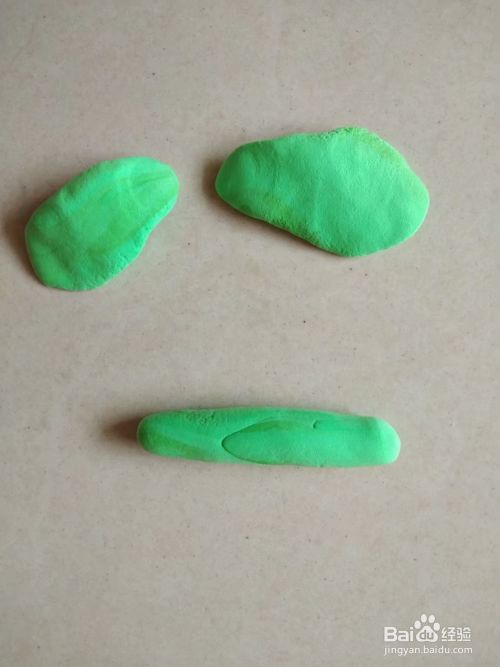 第三步,用绿色的橡皮泥先搓一个长条,当它的花茎,再捏两片叶子,稍薄一点的片状(如图),将花茎粘在粉色圆盘下方,叶子粘在交接处