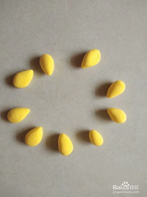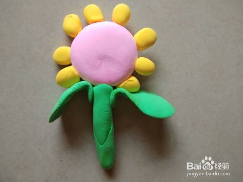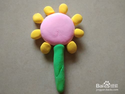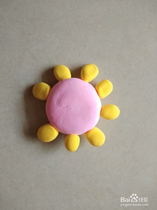 第二步,先用粉色橡皮泥搓一个大大圆盘,稍压扁一点,当向日葵的圆盘,再用黄色橡皮泥搓好几个黄色小水滴形状的,我搓了9个,将它们均匀粘在粉色圆盘的周围,当向日葵的花瓣