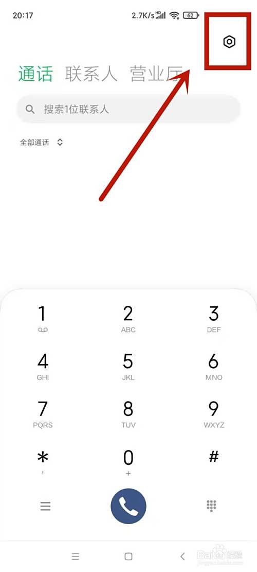 打开手机电话,点击右上角的设置小标。