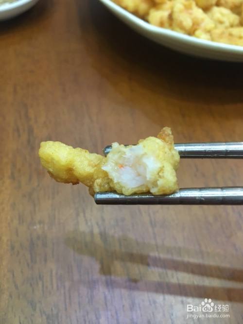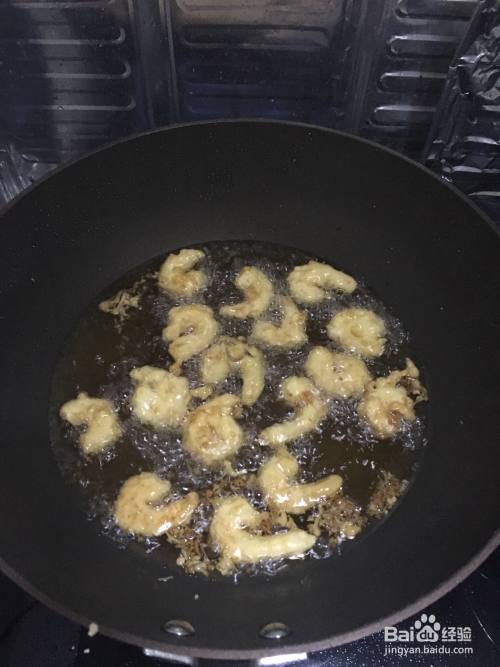 放入挂糊的虾仁,再转中火,定型,翻面,炸制金黄色捞出。一锅炸不完时,转小火,把锅中面糊碎捞出,再转中小火放第二锅重复刚才步骤