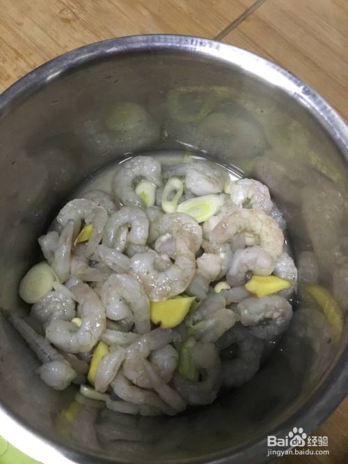 虾仁挑去虾线,葱姜蒜切片,盐一勺半,糖半勺,白胡椒粉半勺,料酒二汤匙,腌制挑去虾线的虾仁。