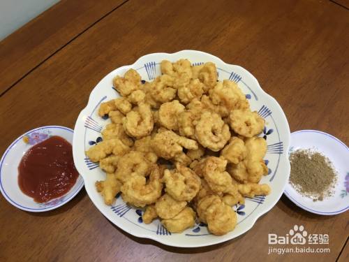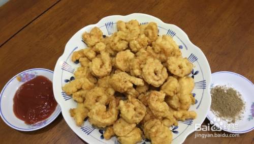 放一碟蕃茄酱,一碟椒盐粉。二吃软炸虾仁大功告成,外酥里嫩哦。