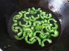 苦瓜切成厚片放入锅中焯水,我们预先祛除苦瓜中部分的苦味,使苦瓜熟后苦味会很少。