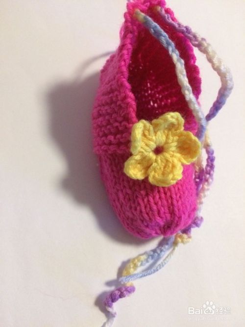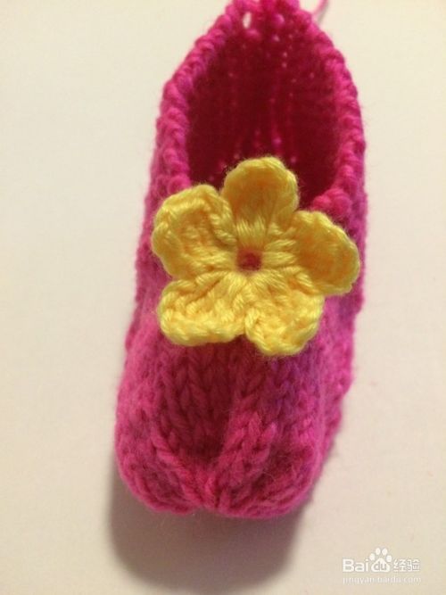 然后翻过面来整理一下,用一条长带子从后跟穿过,再准备一朵装饰画缝合在脚背处。,然后用同样的方法再织一只,这样好看的婴儿鞋子就编织完成了。