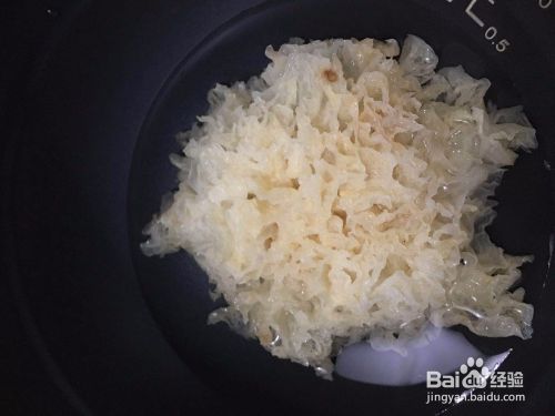 银耳用热水泡半个小时(冷水一个小时)泡开之后撕成小朵,用剪刀剪也可以,然后再洗干净,放入炖锅里,加冷水,淹没银耳。