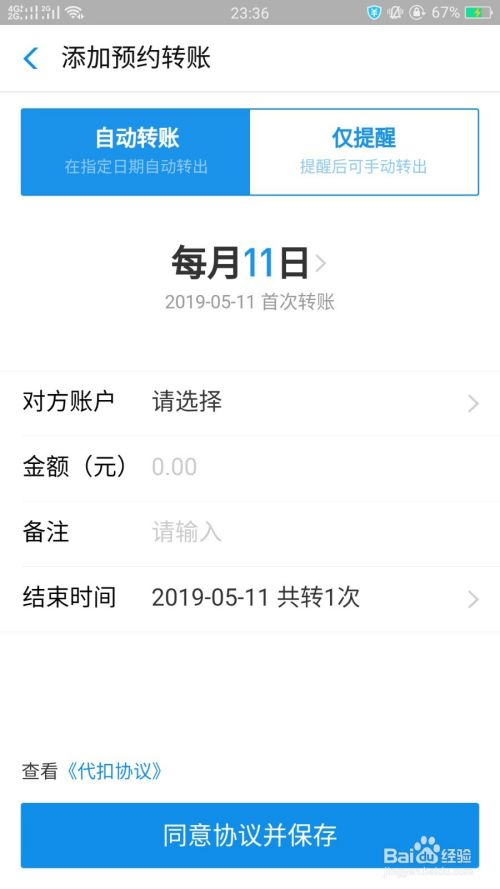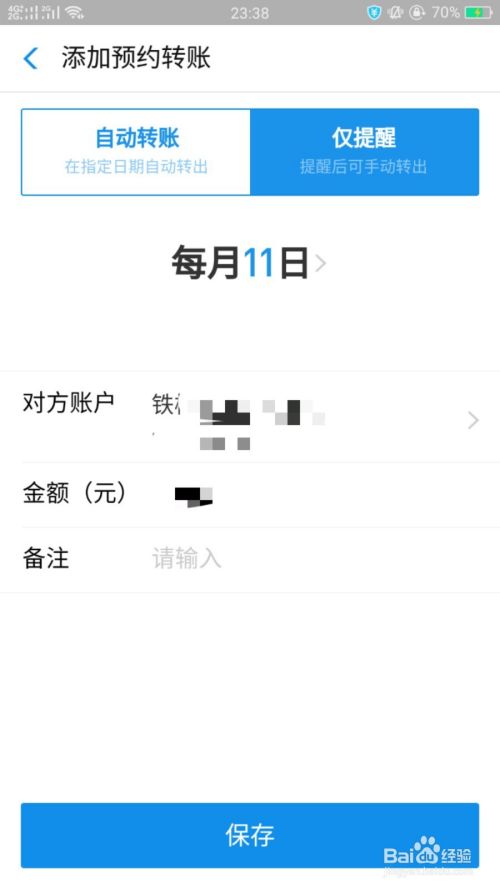 上面一种预约转账方式是自动转账,还有一种方法是到预约的时间,支付宝会进行消息提醒,让你手动进行转账。手动转账设置只需填写好相关信息,点击"保存"即可,如下图所示。