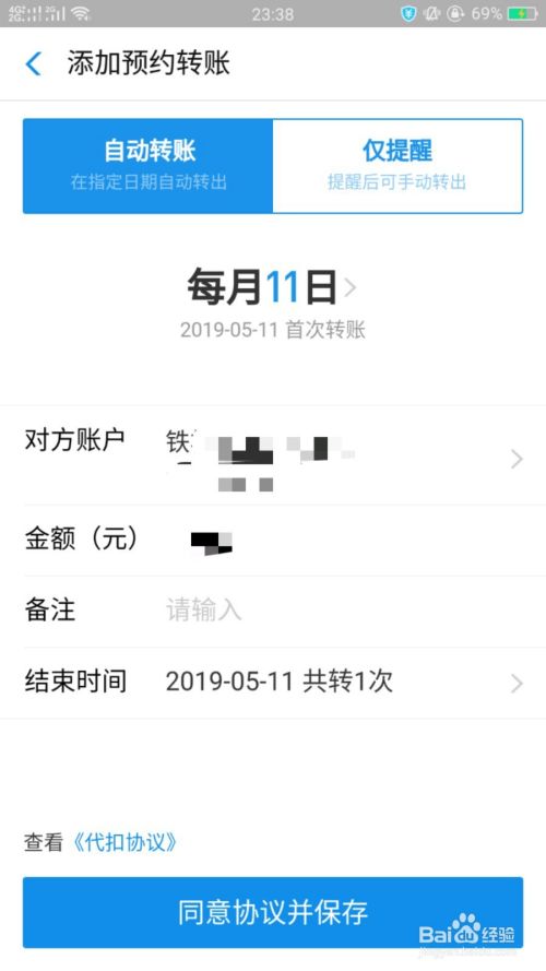 所有预约转账信息都选择并填写好了以后,点击下面的“同意协议并保存”就完成了预约自动转账设置,如下图所示。