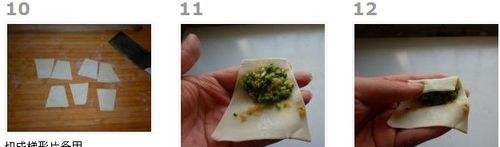 1111取一张皮在手中,在小的一端抹上饺子馅。