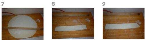 99将面皮切成大虾均等的段,然后伸开来码在一起。