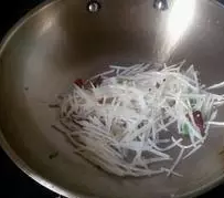 翻炒到萝卜丝和尖椒丝刚刚软就关火,关火后放少许鸡精即可。