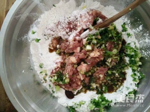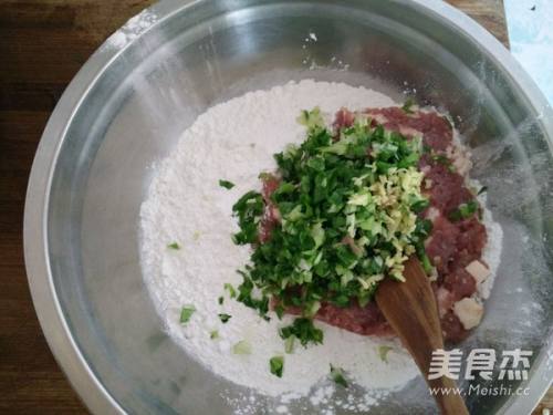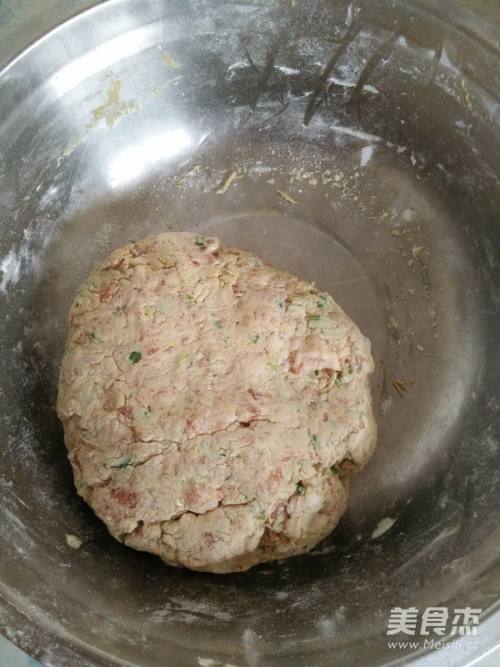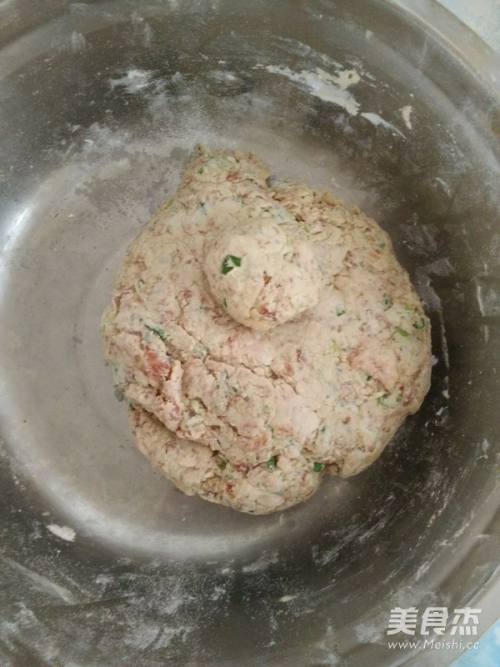 3将肉泥、葱末、红糖水、黑芝麻倒进糯米粉碗里。再加适量的清水用手揉成肉泥糯米团。
