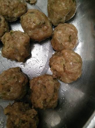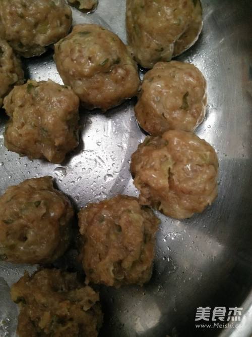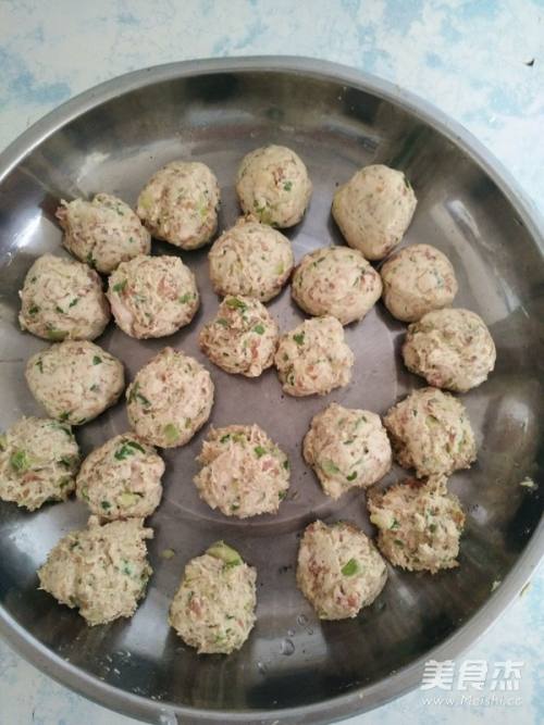 6揉好的肉泥糯米团分别搓成小丸子,如图。