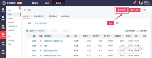 新建商品:使用系统第一步需要建立商品档案,在系统后台找到商品栏目,点击【新增商品】,将必填信息一一填入。