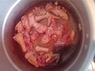 注意了,在放水炖汤之前有一步很重要。那就是把切好的鸡肉放入锅内煎一下,煎到什么程度呢?鸡皮稍微出一点油就可以了。这样鸡肉的香味就出来了。