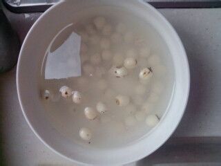 莲子洗净,用清水浸泡。最好买去了芯的,不然炖出来的汤会有苦味。