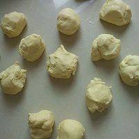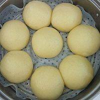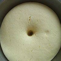 等到玉米面温热时加入200克的面粉,加入90克牛奶和4克酵母和成面团