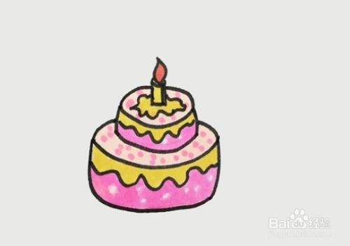 最后给蛋糕涂上颜色,给蛋糕的侧面涂上粉红色,白色的波点,花纹和蜡烛涂上黄色,顶面涂上黄色和粉红色的波点。火焰涂上红色。一个简单又漂亮的蛋糕就完成了。