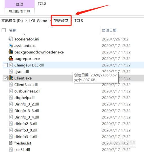 点击后会弹出英雄联盟的安装文件夹,接着点击地址栏中的“英雄联盟”目录