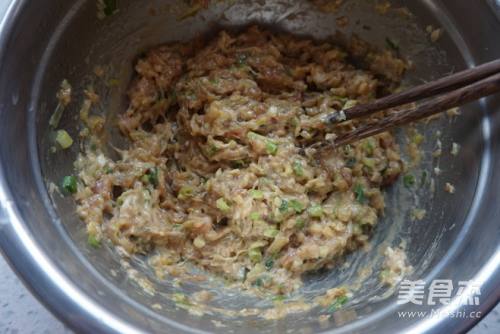 3猪肉馅加入料酒,生抽,酱油,盐,花椒粉、姜末,葱碎朝一个方向搅拌上劲。