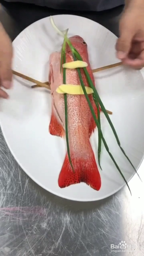 我们将东星斑处理干净,改刀方便入味,将鱼放入盘中,底部用筷子架起来,保证受热