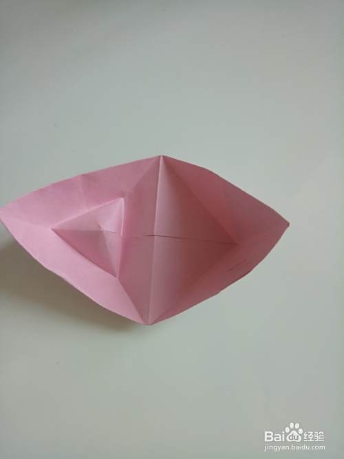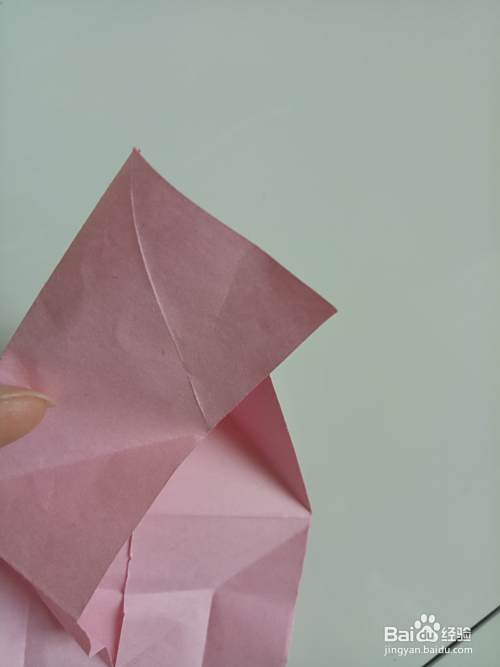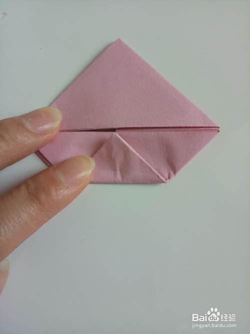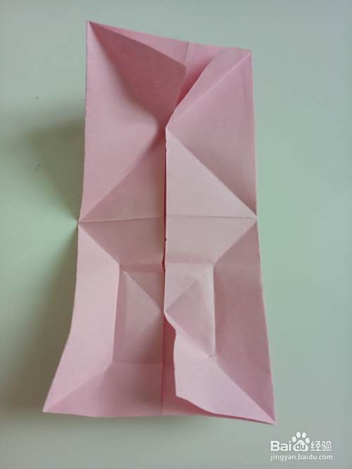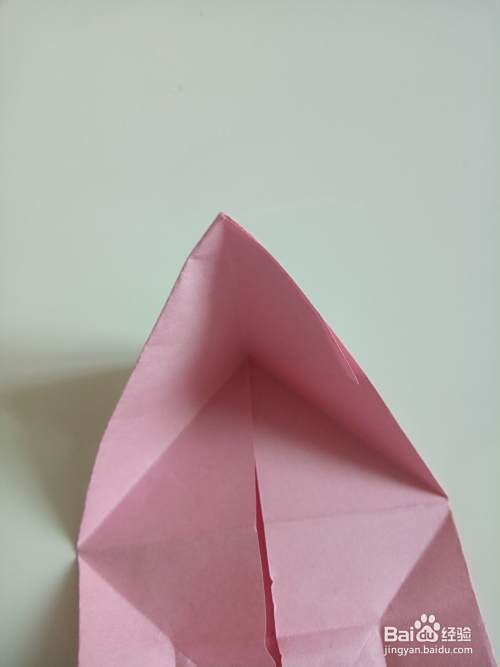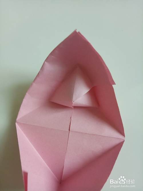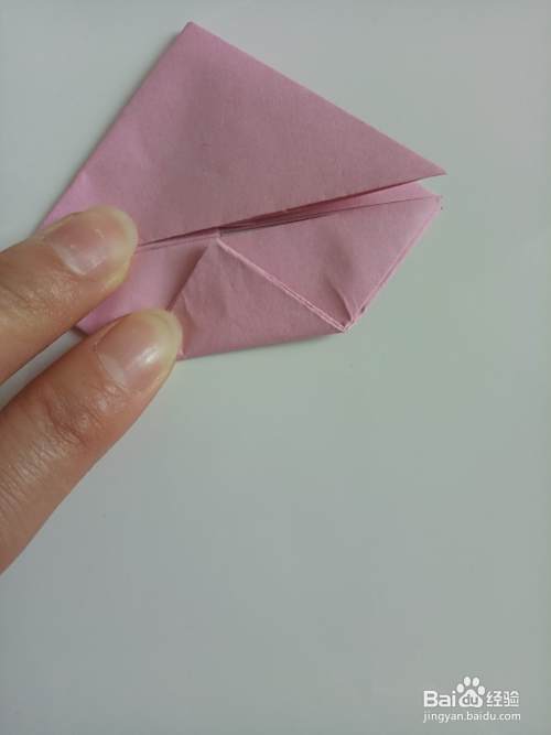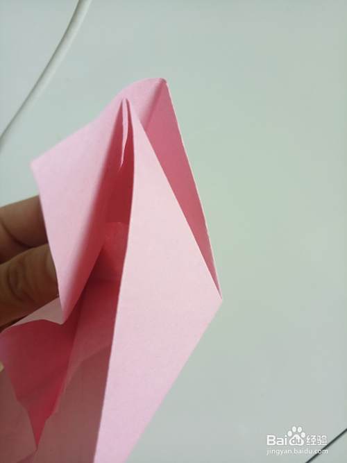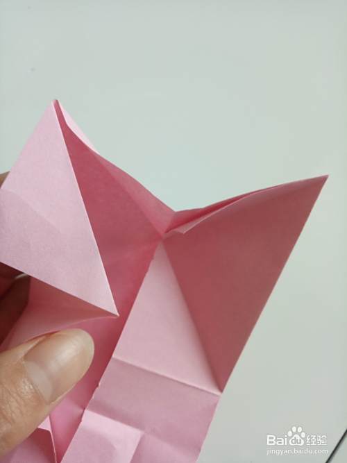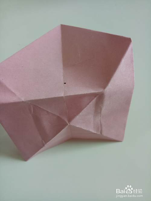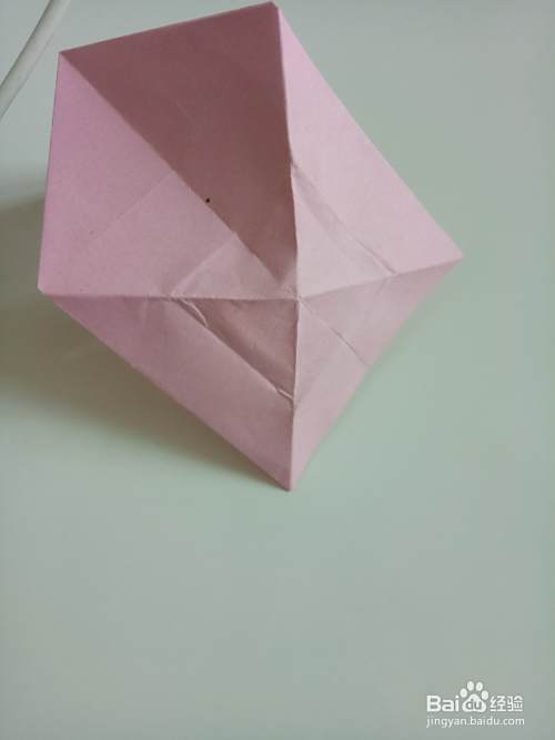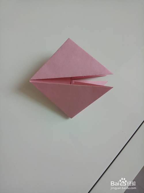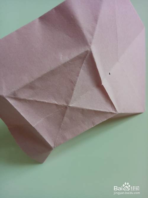 折好后就像一个立体三角形,接着将折有正方形的一边,也按照这样的方法折。但是折的时候,要把中间折凸起来。