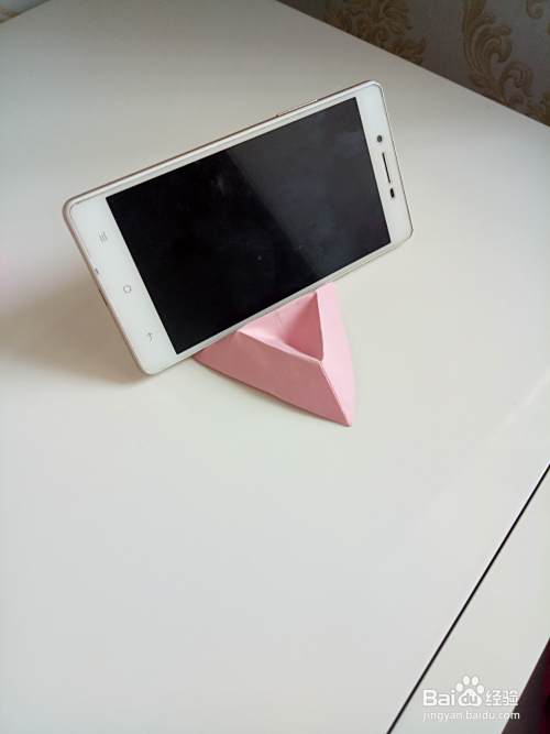 最后用胶水把两头翘起的纸粘一下,然后在翻到另一面,把手机放到凹槽里,就可以当手机架使用啦。
