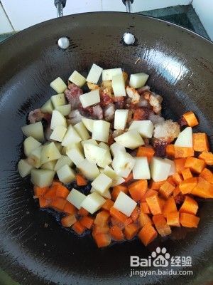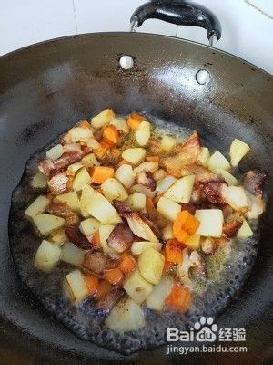 在爆好的猪肉里放入胡萝卜土豆,放入盐、耗油、酱油。