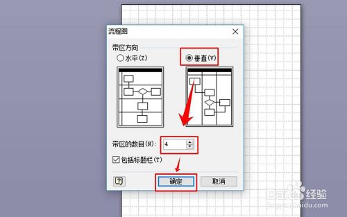 点击“确定”后,页面就会跳转至带区方向选择页面,软件默认的是水平方向,但是在职场中比较常用的是垂直方式,我在这里选择【垂直】,然后在下面图示位置的调整带区的数量(根据我们要设计的流程图中涉及的部门数量确定)。
