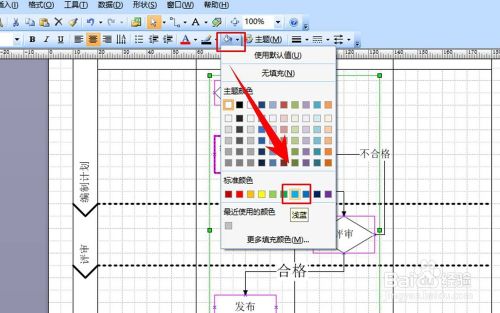 为了让流程图显得更加的醒目、美观,更加具有可阅读性,我们还需要对流程图中的图形进行填充颜色。点击鼠标左键,然后在工具栏中点击油漆桶图形的图标,然后在其下拉列表中选择一种颜色,那么这个被选中的图形就会自动被填充为该颜色了。