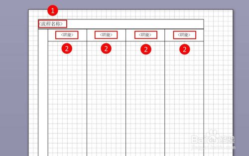 选定好点取方向,并设置好带区数量后,在画布上就会自动生成一个如图所示的流程图模板,用鼠标在图示位置1进行双击,就可以在此位置输入流程图的名称;在图示2位置用同样的方法就可以输入部门的名称。