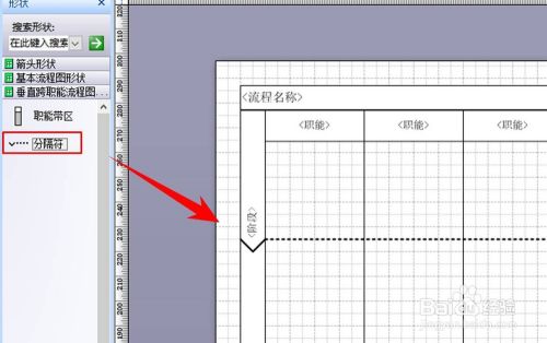 在制作流程图的时候,我们一般会把工作划分为几个大的阶段,为了将各个阶段显示的更清楚,我们就可以通过选中形状区的分隔符,拖动至画布上相应的位置,就能完成分隔符的添加。如果将要减少分隔符,则可以在分隔符左侧位置点击鼠标左键,将其选中,然后按Delete键删除。