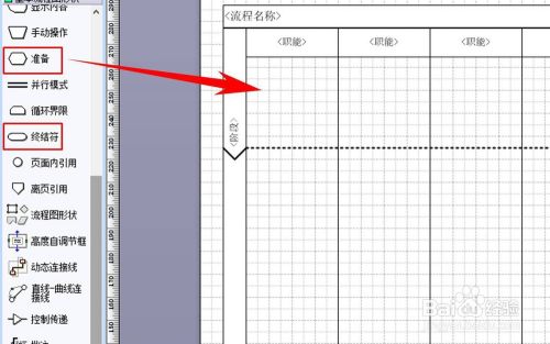 如果在第2步没有设置足够的职能带区,那么还可以在软件左侧的现状栏中找到职能带区的形状,点击选中按住鼠标左键,将其拖入到模板的尾部位置,就可以实现职能带区的增加。