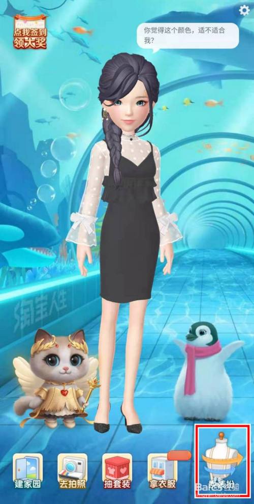 在淘宝人生主界面,水族馆小姐姐,点选右下角的换装扮;