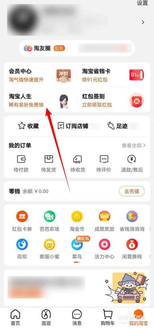 在我的淘宝页面,四宫格中点选会员中心下方的淘宝人生入口;