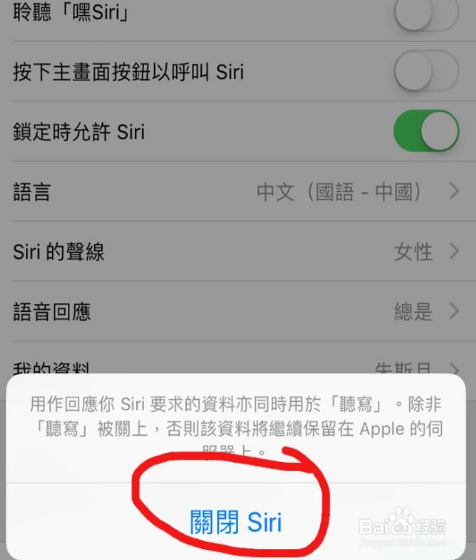 然后点击【按下主画面按钮以控制呼叫Siri】就会弹出【关闭Siri】的窗口,点击【关闭Siri】。