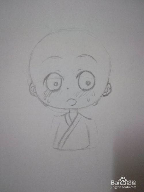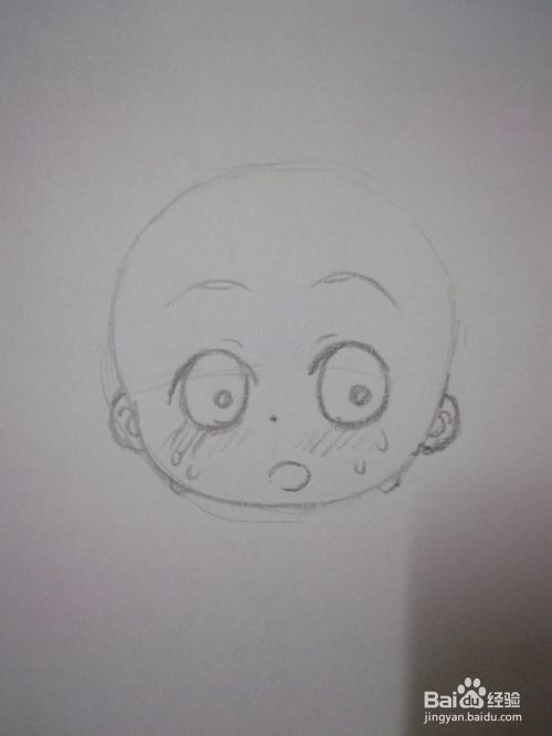 在圆的边边上修出人物头型和脸型轮廓,然后再画出人物五官,最后画出脸上的红晕和汗水。