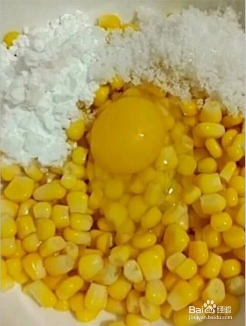 首先准备玉米粒,这里我用的超市买的即食的玉米罐头。然后加入淀粉跟面粉,比例1:3。再加入一勺白糖。打入一个鸡蛋。然后用筷子搅拌一下。