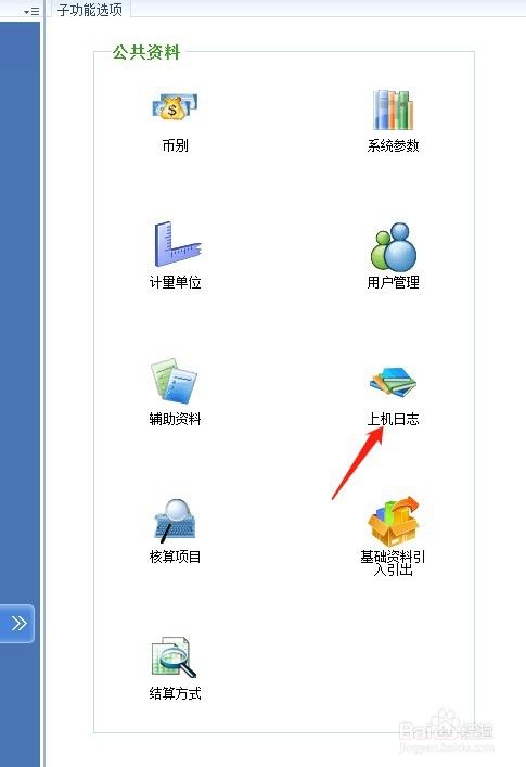 然后会跳出子功能选项页面,在公共资料模块,点击“上机日志”