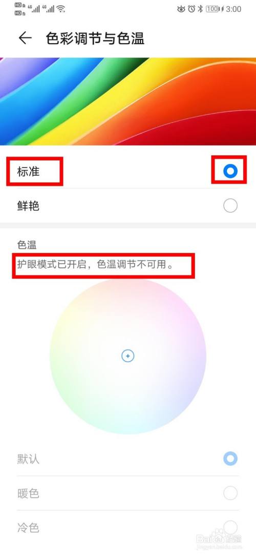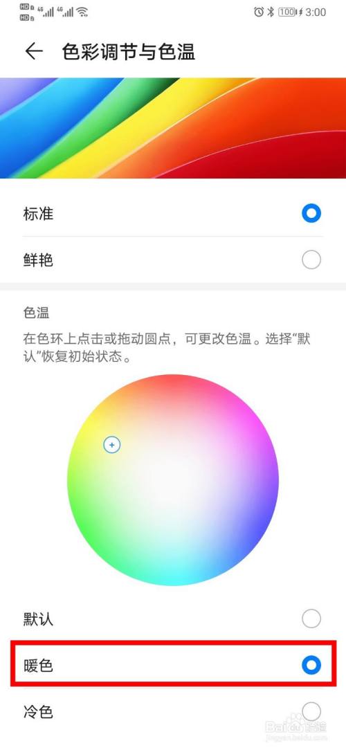 接着返回【色彩调节与色温】界面,此时色温选项就可以设置了,点击【暖色】选项,屏幕即可自动调节到【暖色】