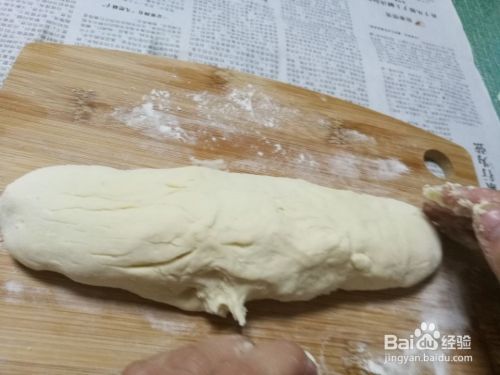 再拿出来放在一块撒了点面粉的木板上,继续揉匀,然后做成长条状。