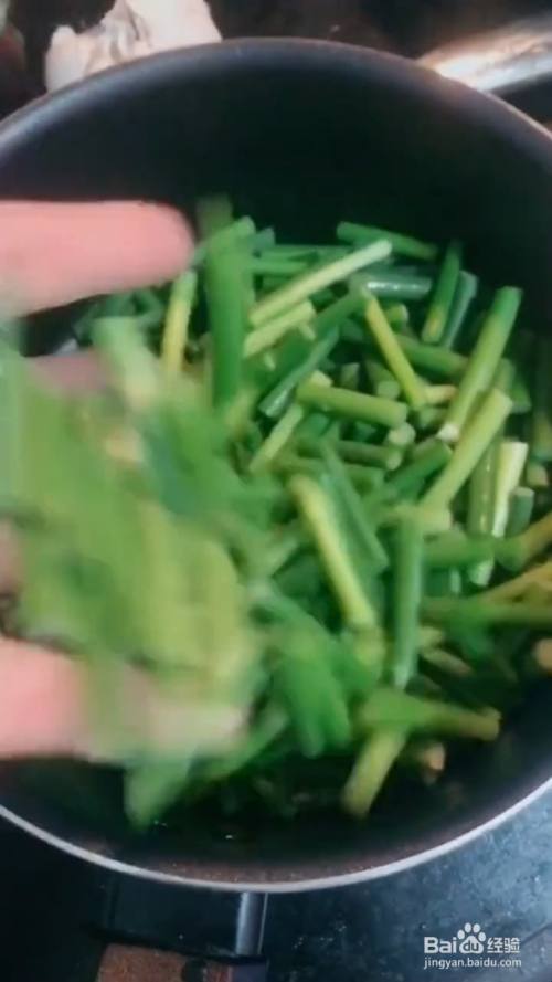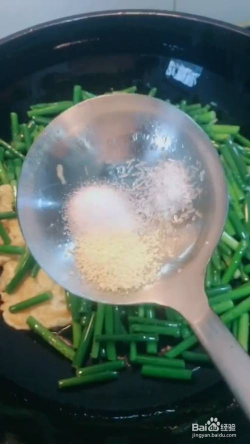 滑熟倒入蒜苔,加入5g鸡精,5g盐,5g味精,10克酱油,翻炒均匀即可