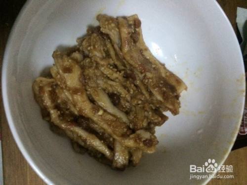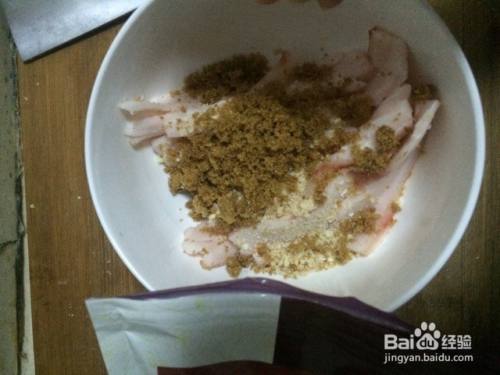 把切好的肉放碗里洒点凉水,加入花生碎,柠檬皮碎,在加入适量红糖,用手抓匀,使每片肉都均匀粘上红糖等。
