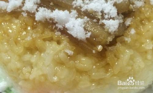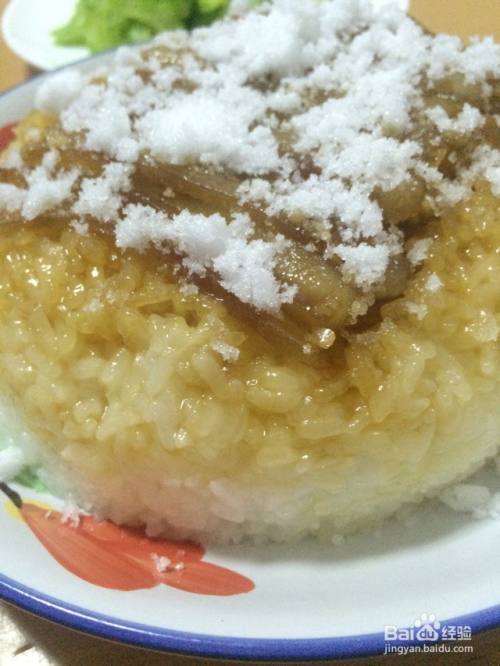 蒸好拿出后拿个盘子扣碗上,翻转过来,把碗揭下来,撒上白糖。