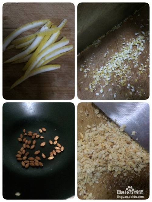 柠檬皮切成小颗粒,尽量小点(其实应该用干橘子皮炒炒压成细颗粒的,可是家里没有就拿柠檬皮代替了)花生炒熟去皮用刀压成小颗粒备用。