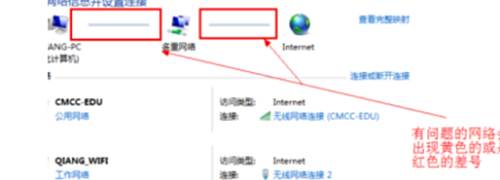 在网络共享中心中第一条就是我们目前网络连接的示意图,查看在那个位置有问题。一般会在连接有问题的地方出现 黄色的叹号或者红色的叉号。